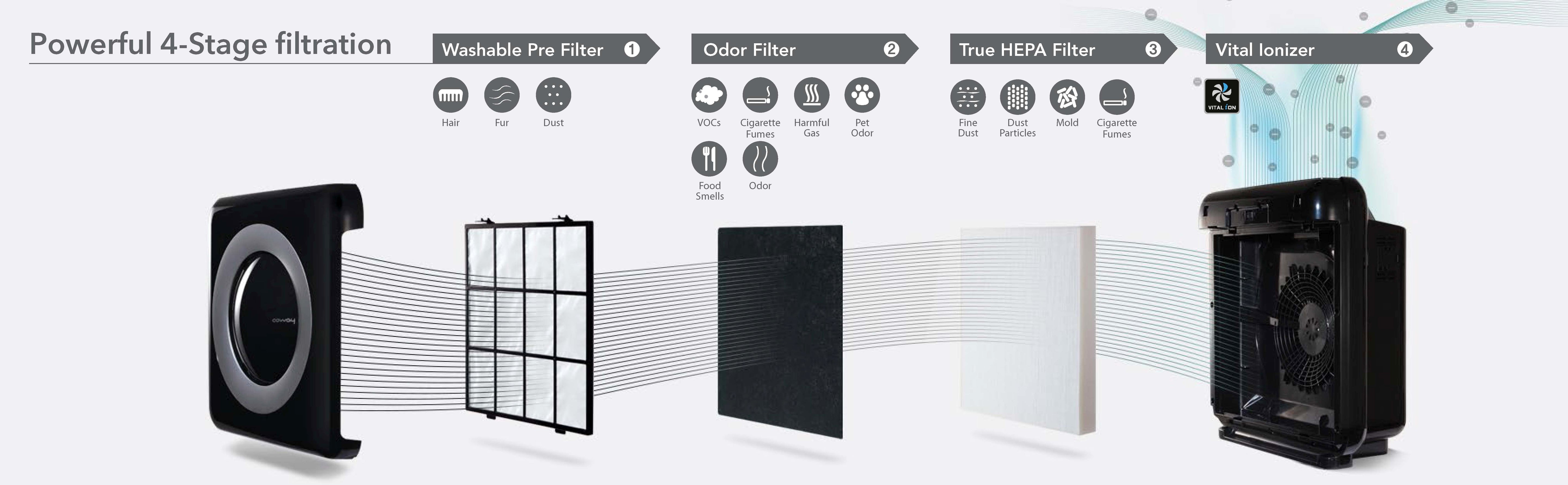 At Coway, we want to reassure your wellbeing;for this reason, we developed the industry-leading HyperCaptive™ Filtration process, to remove up to 99.999% of nano-sized particles as small as 0.01μm. Combined with our patented and labtested Coway GreenHEPA™ technology, our filters capture and further neutralise potentially harmful particles. We are Air Makers, aiming for supreme cleanliness by filtering even the smallest allergen, bacteria, dust, mould, pollen, viruses and also bad odours and VOCs.